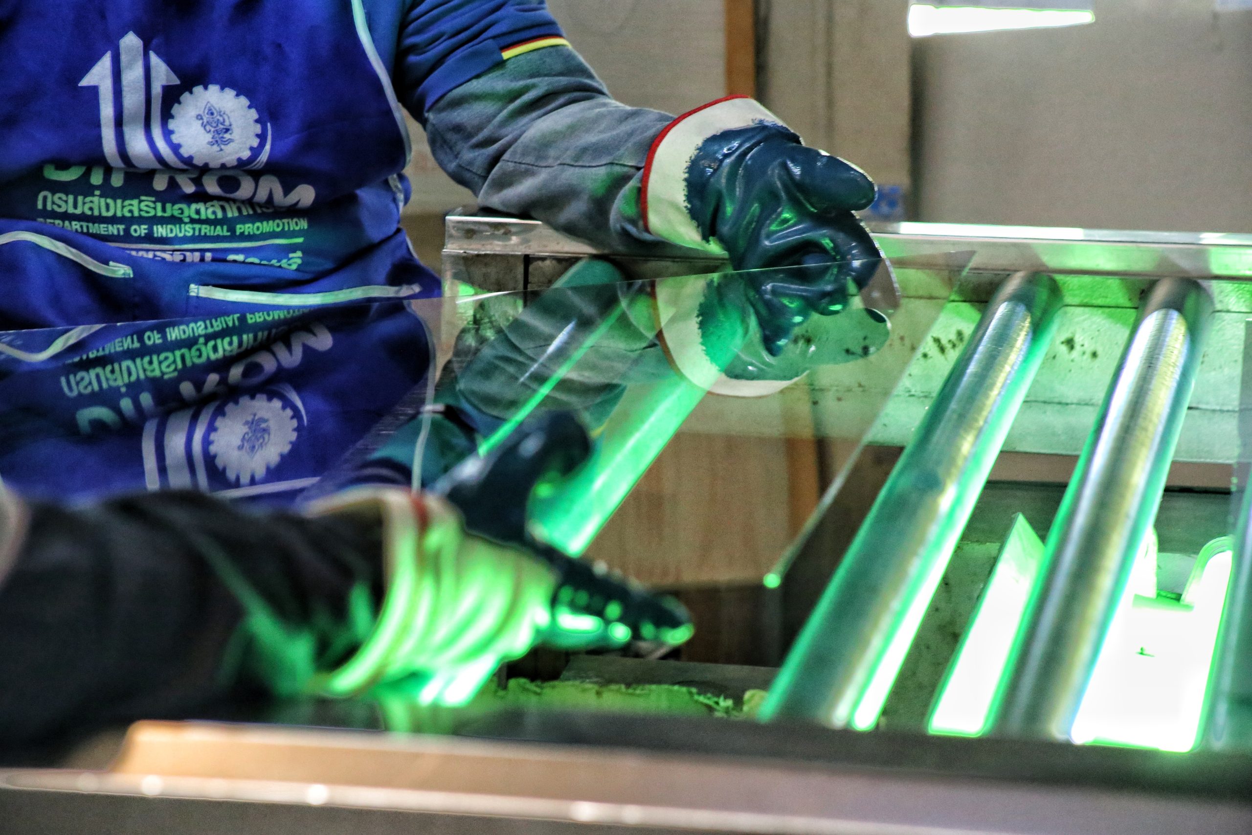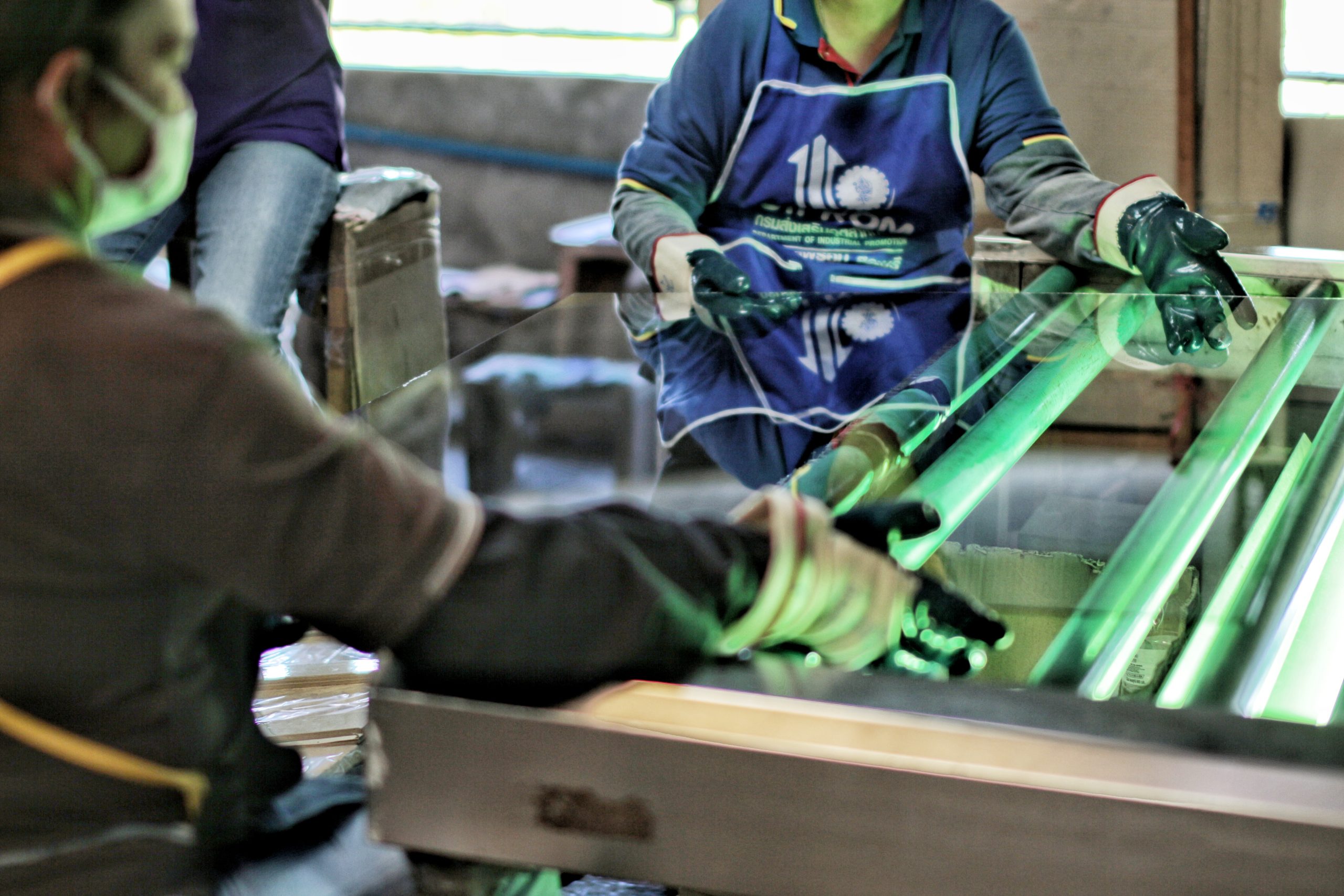 งานขัดฝ้ากระจกของทางบริษัทฯ ใช้การปัดผงเหล็กแทนการพ่นทราย